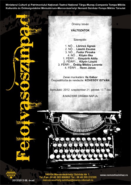 17.00 órától a Nagyterem színpadán a Változatok című felolvasószínházi előadásra kerül sor. Az Örkény István szövegeiből összeállított produkciót Kövesdy István rendezi, szereplői: Lőrincz Ágnes, László Zsuzsa, Fodor Piroska, Kilyén Ilka, Gáspárik Attila, Kilyén László, Ördög Miklós Levente, Henn János színészek.