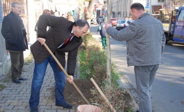 Pénteken a város főterén, a Divatház környékén zajlott az egyik faültetési akció, az Ortodox Katedrális mellett. Az eseményen Dorin Florea, polgármester is résztvett, aki a kertészet szakembereivel törökmeggyeket ásott el.